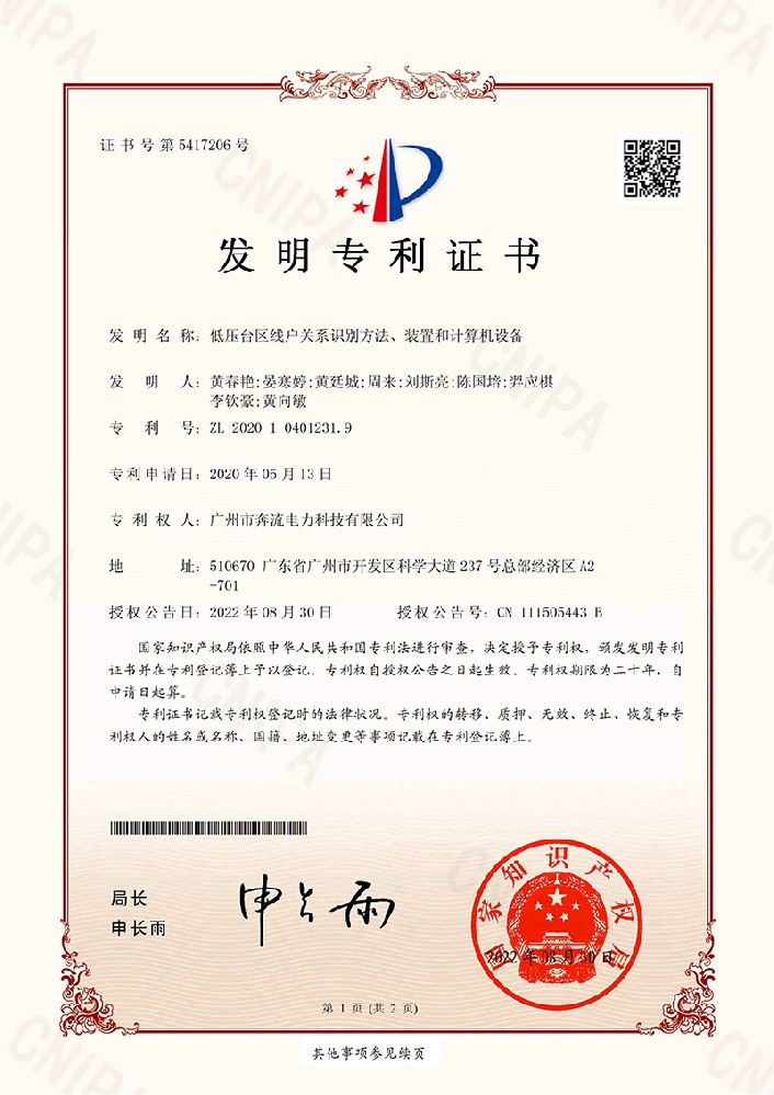 臺(tái)區(qū)相戶(hù)關(guān)系的可信度檢測(cè)方法、裝置和計(jì)算機(jī)設(shè)備-發(fā)明專(zhuān)利證書(shū)